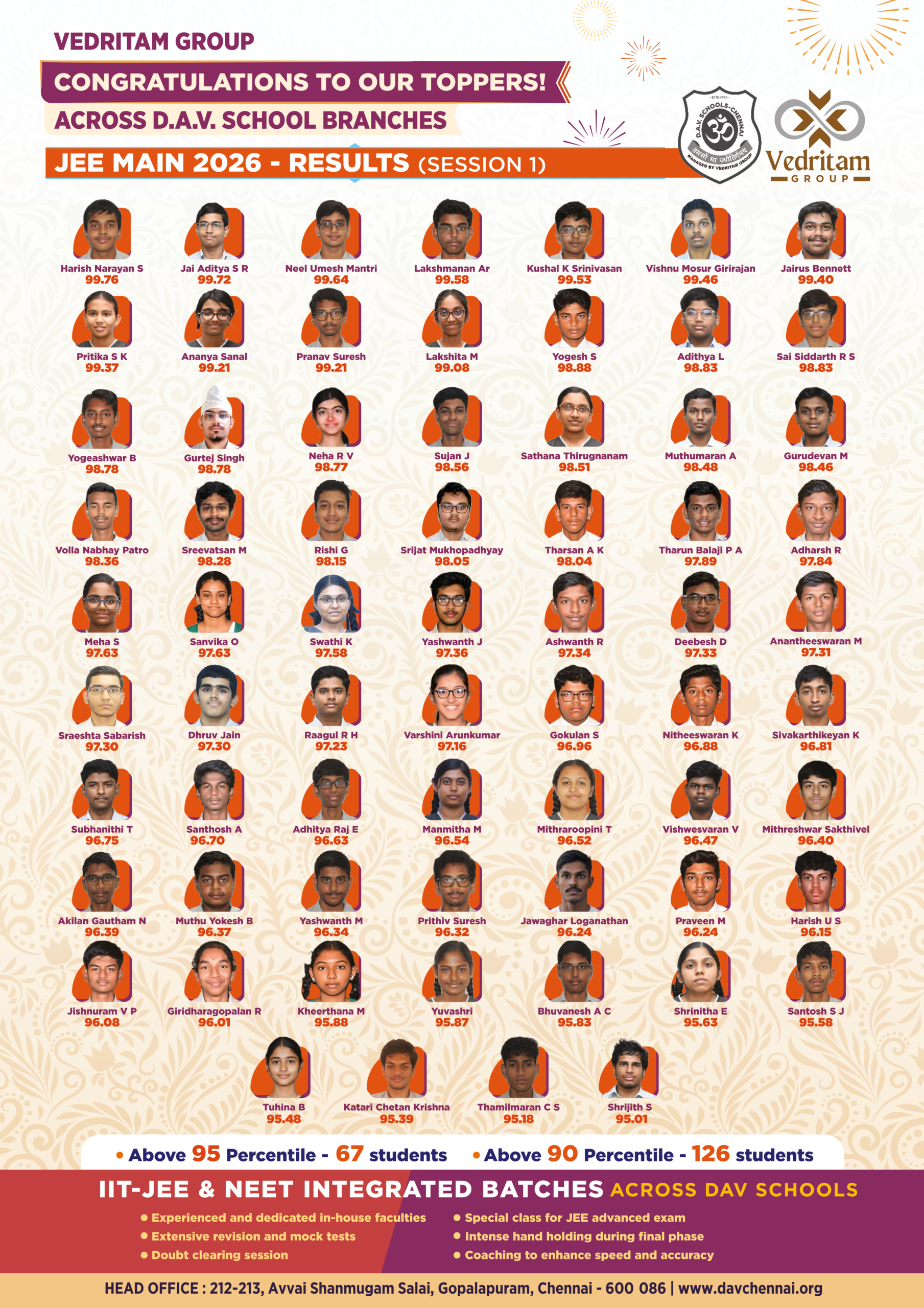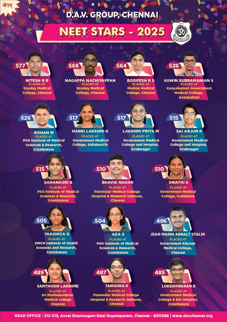 As one of the core verticals of the DAV Group, Chennai, the NAT department empowers students to excel in competitive exams while meeting their academic milestones. Its in-house programs complement the CBSE curriculum, providing a holistic education that blends strong academics with character development and essential life skills.